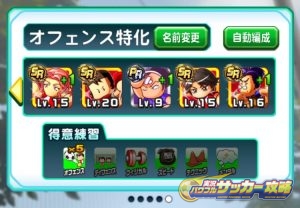 その名の通り、オフェンスに特化したデッキ編成となるわけだが、ポイントは、助っ人を含めて合計6選手を当てはめられるイベキャラ枠のうち、5枠以上をオフェンス練習を得意としている選手で埋めることにある。