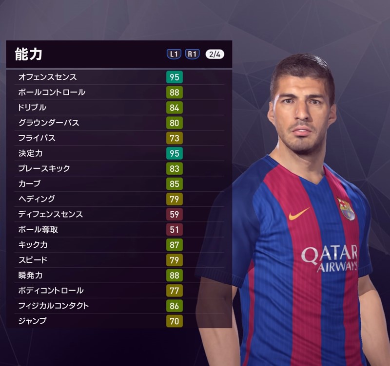 そして、堂々の1位はスアレス!とにかく点取り屋としての“巧さ”が際立っており、ボールを持っても持たなくても超一流のプレーぶり。オフェンスセンス95というところにも彼の凄みが表れている。