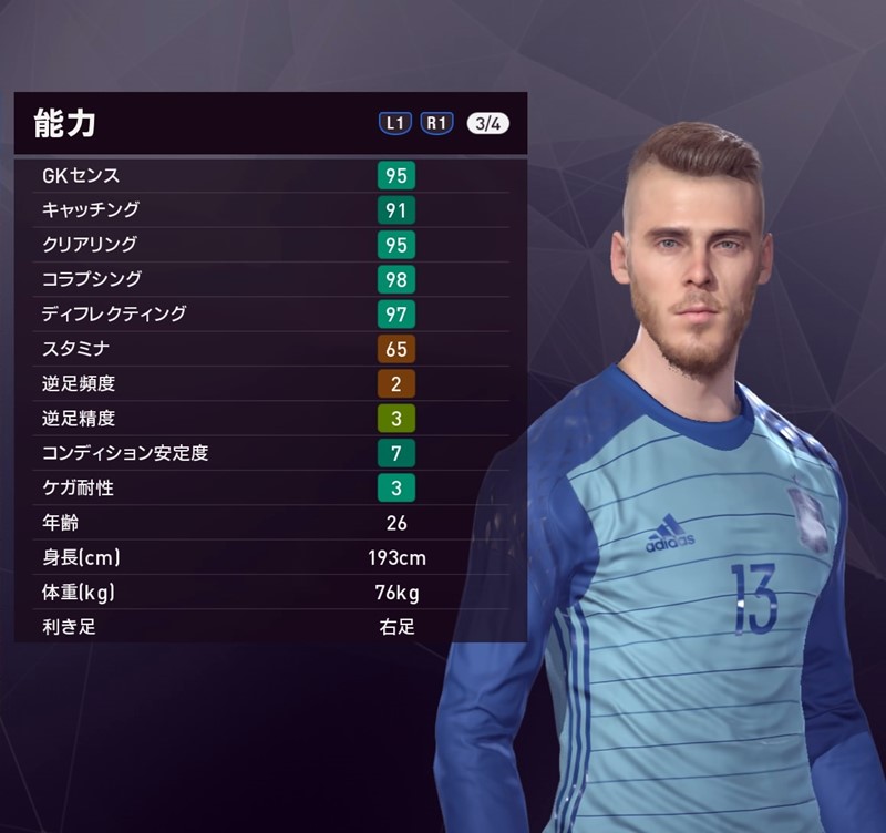 言わずと知れたドイツ代表の怪物GK、ノイアー。スケールの大きさは過去の名手たちと比較してもある意味破格であり、新時代の守護神像を築き上げた。スタミナ87は彼ならではだろう。