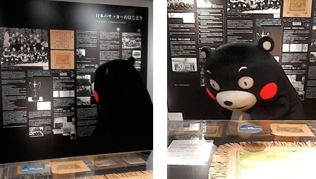 大仁邦彌名誉会長との会談を終えたのち、JFAハウスの中にある日本サッカーミュージアムを見学しにやってきたくまモン。大仁氏の説明や展示物に終始興味津々で、3Dシアターでは眼鏡を片手に迫りくる迫力を楽しんだり、ロッカールームでは選手用ロッカーに無理に座ってみたりと、くまモンもサッカーミュージアムの歴史や魅力にすっかり魅了された模様だ。