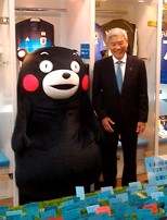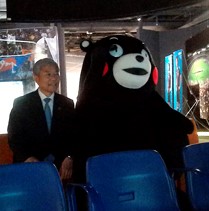 (ぼくだってちゃんと入るモンと椅子席に座るくまモンと大仁氏)