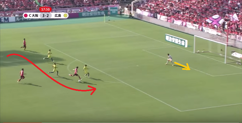 左サイドから右サイド方向へと杉本がドリブルしたことにより、広島GK林卓人は若干ポジションを左側に取った。それにより杉本から見てファーサイドが空き、重心が右側に傾いていた林はこれに反応することができなかった。