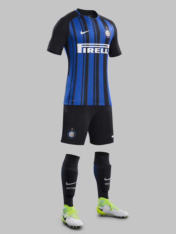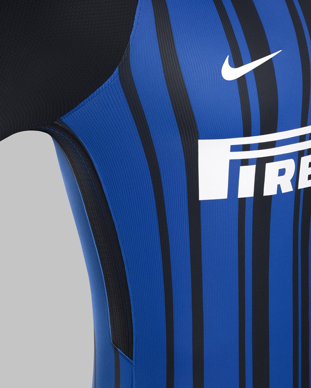 インテルの2017-18ホームユニフォームは、クラブカラーでチームの愛称でもある“ネッラズーリ”(黒と青)を用いたモダンなストライプが特徴のデザイン。