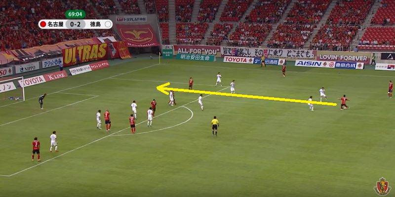結局このシーンはオフサイドではあったが、田口と杉森考起のホットラインは名古屋の得点パターンの一つである。