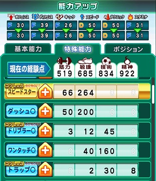 まずはコツレベルについて。コツには5段階のレベルがあって、コツレベルが上がると、特殊能力獲得に必要なポイントが大幅にダウンします。ダウンさせた分を、効率よく基本能力に割り振ることで、強い選手が育成可能になるのです。