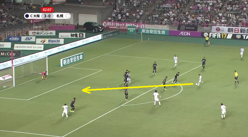 この時C大阪の選手たちは完全に引いており、DFとGKの間にスペースはほとんどなかった。