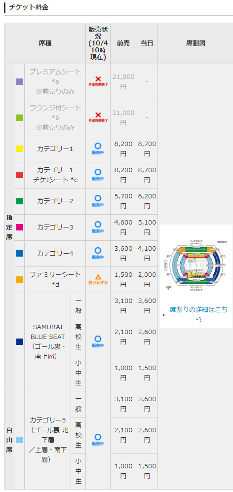 プレミアムシートやラウンジ付シートといった枚数が限られている高級席を除くと、全ての席が販売中。ファミリーシートこそ「残りわずか」となっているが、その他は十分な余裕があることを示す「販売中」となっている。