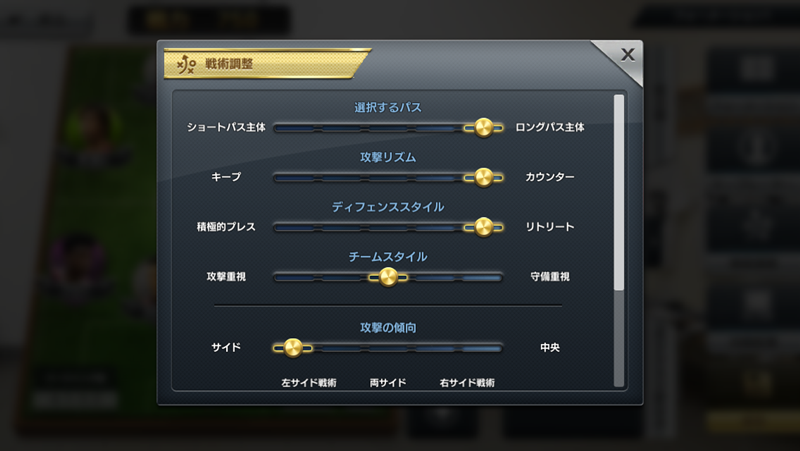 また、このスタメン変更画面の右にある「戦術調整」からチーム戦術を設定できるのだが、ここでもいい感じのこだわりが見られる。
