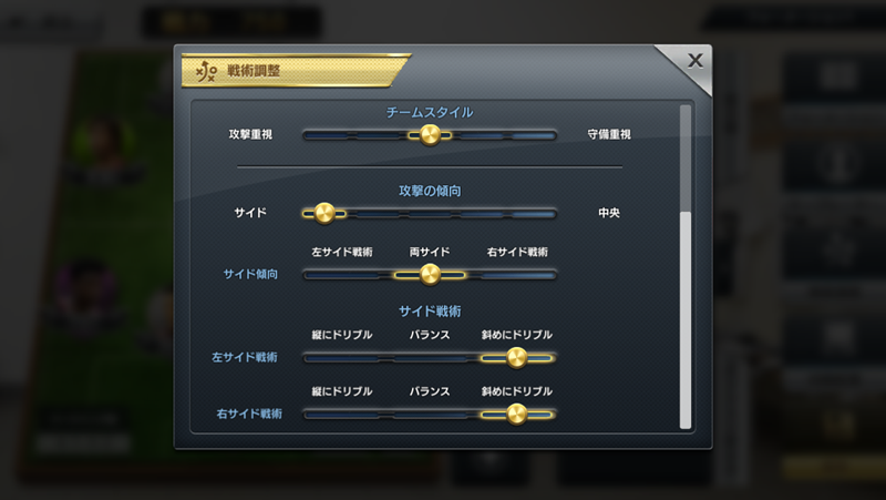 しかも一番の下の「サイド戦術」では、左右それぞれのサイドの選手が縦にドリブルするのか、それとも斜めにドリブルするのかを決められるのだ。
