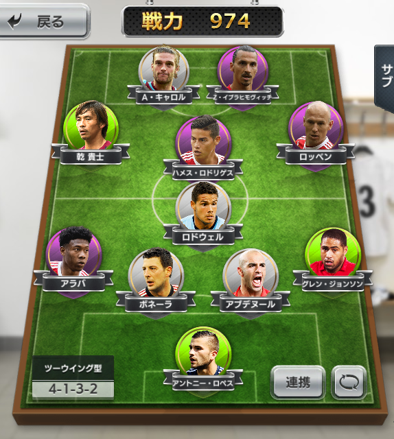 攻撃的な4-1-3-2のフォーメーションを採用し、2列目には乾、ハメス、ロッベンを並べた。守備は任せたロドウェル!なお、選手の背景色はレア度を表している。
