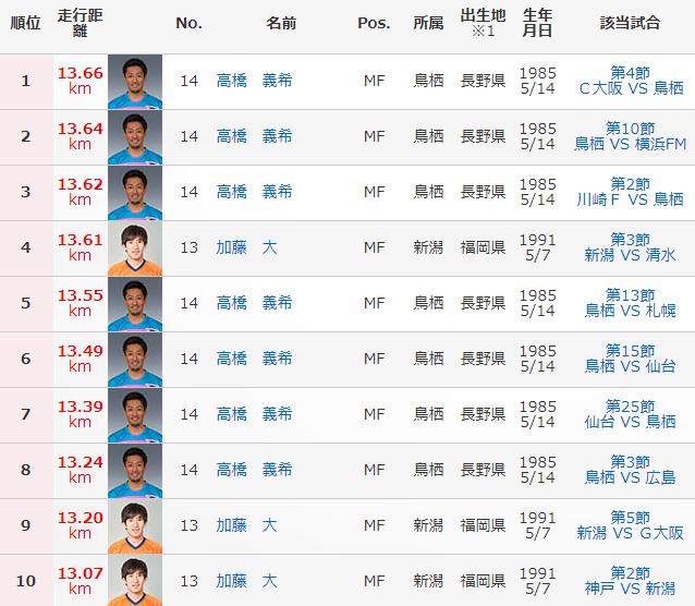 サガン鳥栖MF高橋義希とアルビレックス新潟MF加藤大という、お馴染みの“走り屋”がランキングを独占していたのだ。