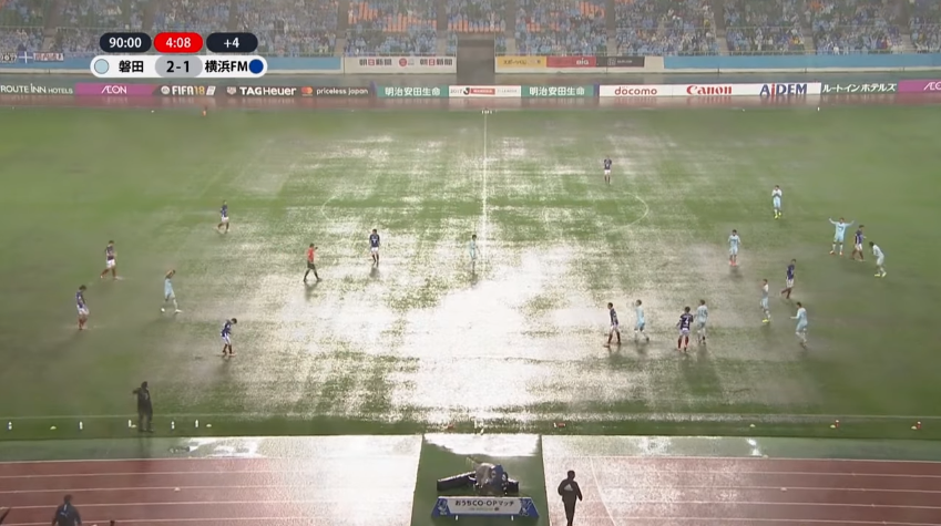 敗れた横浜FMのエリク・モンバエルツ監督は「前半はサッカーができるコンディションだったが、後半は水球みたいな状態だった」とピッチ状態を表現している。