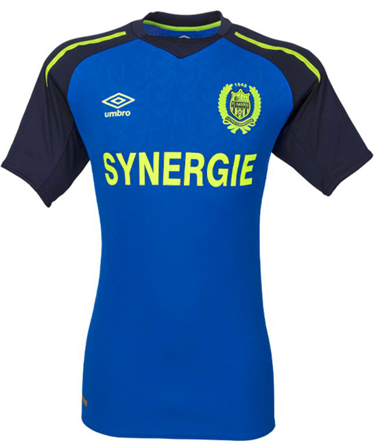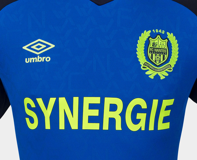 新しいアウェイキットはブルーとネイビーのコンビネーション。肩から袖のUmbroロゴマークはホームキットとは異なり、蛍光イエローのテープにプリントしたモダンなスタイル。