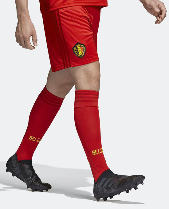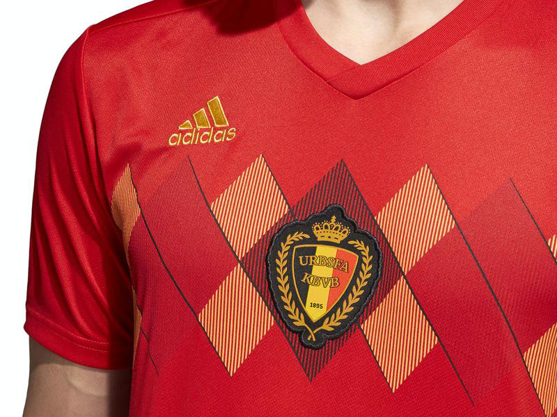 背面の首元にはベルギー国旗色でアーガイル柄をプリント。シャツと同系色のスリーストライプスは脇部分に配している。
