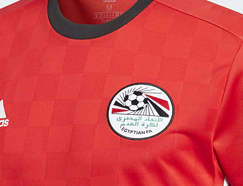 国旗のレッドを強調した定番カラーだが、チェッカーボード柄というエジプトにしては意外性のあるデザイン。スリーストライプスは脇に配している。首周りや袖口をブラックで彩るパターンは、2012年ロンドン五輪で使用したユニフォームに近い。