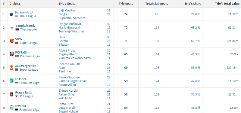 そんな3選手の破壊力は世界でも上位であったようだ。『transfermarkt』で3トップ別の総得点ランキングを見てみると…