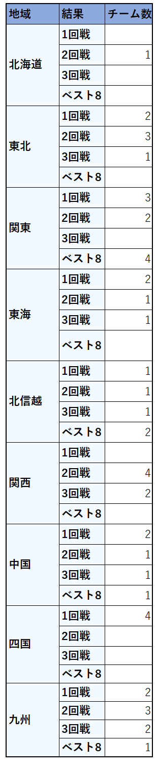 東北や関西が全滅していることを考えると検討しているといえるだろう。反面、四国はすべて1回戦で敗退、四国民にとっては悲しい結果となった。
