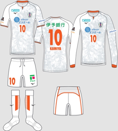アウェイ(2nd)は、白を基調としたデザイン。ホーム同様の「伊予柑柄」がはっきりと確認できる。