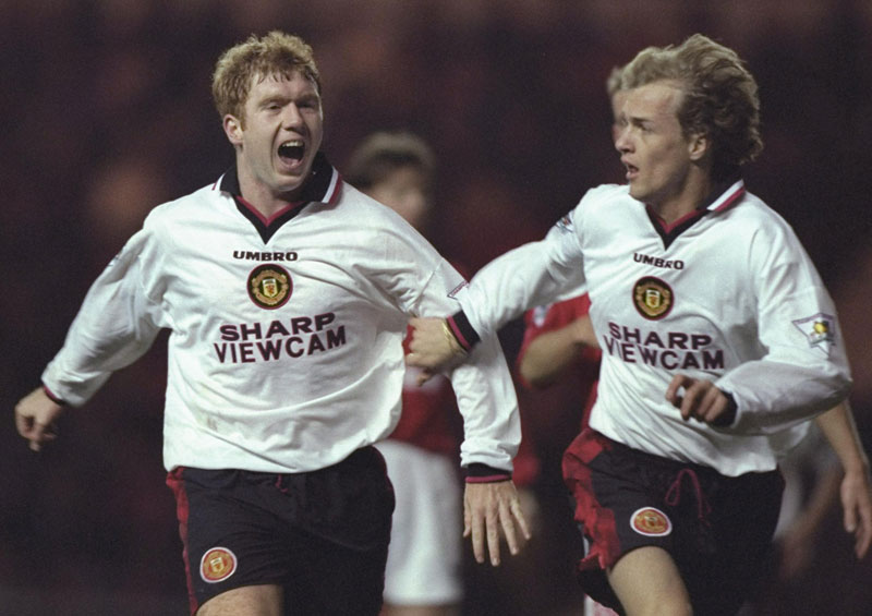 このシーズンはホームキットの印象が強すぎて、このアウェイキットは存在感がちょっと薄かった。デザインはシンプルで斜めのシャドーストライプを施している。ポール・スコールズとともに喜んでいるのは、ジョルディ・クライフ。