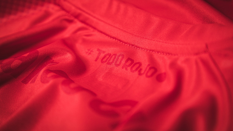 衝撃の真っ赤なユニフォーム。胸スポンサーは付かないが、袖と肩のスポンサー、エンブレム、メーカーロゴなど全て赤でまとめている。袖スポンサー“Audifarm Salud”は医薬品企業。