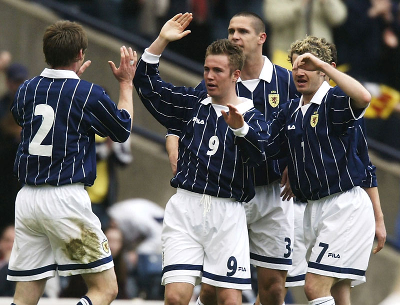 EURO 2004予選などで使われたユニフォーム。デザインはウェストハムの2002-03シーズン用アウェイと同じで、襟付きにピンストライプ。ちょっとお洒落でレプリカユニフォームも人気があった。Filaとの契約期間は短かったがホーム、アウェイともに2種類リリースしている。