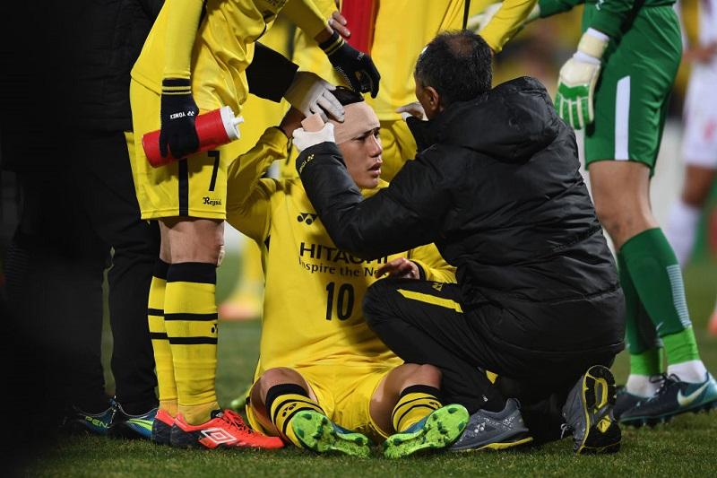 江坂は眉の上あたりを切り、止血処置のため試合は4分間ほど中断となった。