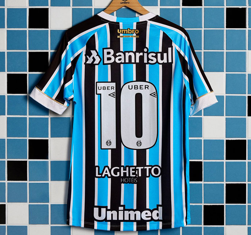背面にもゴールドのメーカーロゴ。背番号には“UBER”(配車アプリ)のスポンサーロゴが入る。番号下には“Laghetto Hotéis”(ホテルチェーン)と“Unimed”(保険会社)のスポンサーロゴも。“Banrisul”も入れると背面に4社もスポンサーが付くのはリベルタドーレス優勝の効果か?