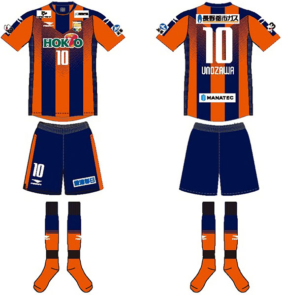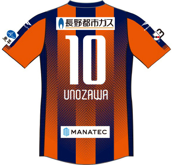 背面もシェブロンラインのグラデーションを施している。肩スポンサーは「長野都市ガス」で継続。腰スポンサーは新たに「MANATEC」となる。