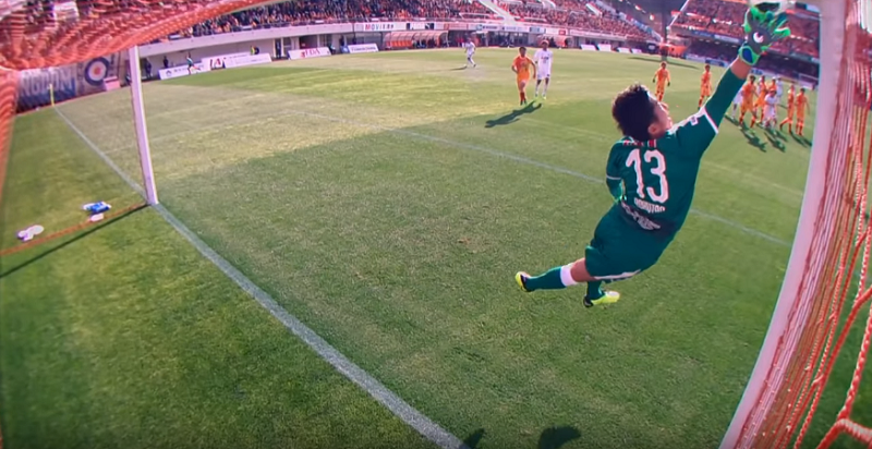 スタンディングポジションからかなり遠い位置にボールが飛びはしたが、予測力と跳躍力でこれに食いつくのは流石日本代表経験者!