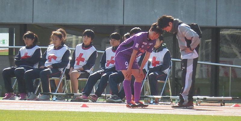 バニーズは伊賀の“幅”と“深さ”のある攻撃に前後左右に揺さぶられた。しかも、日本代表候補の新加入FW谷口木乃実(下記写真:背番号9)が、23分という早い時間帯で負傷交代となったのも痛かった。彼女は、相手の裏を狙った縦パス1本でボールを収められる選手。苦しい展開の中で陣地を回復させる狙いで初先発となったはずだった。