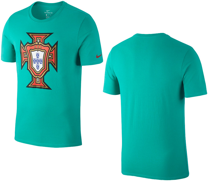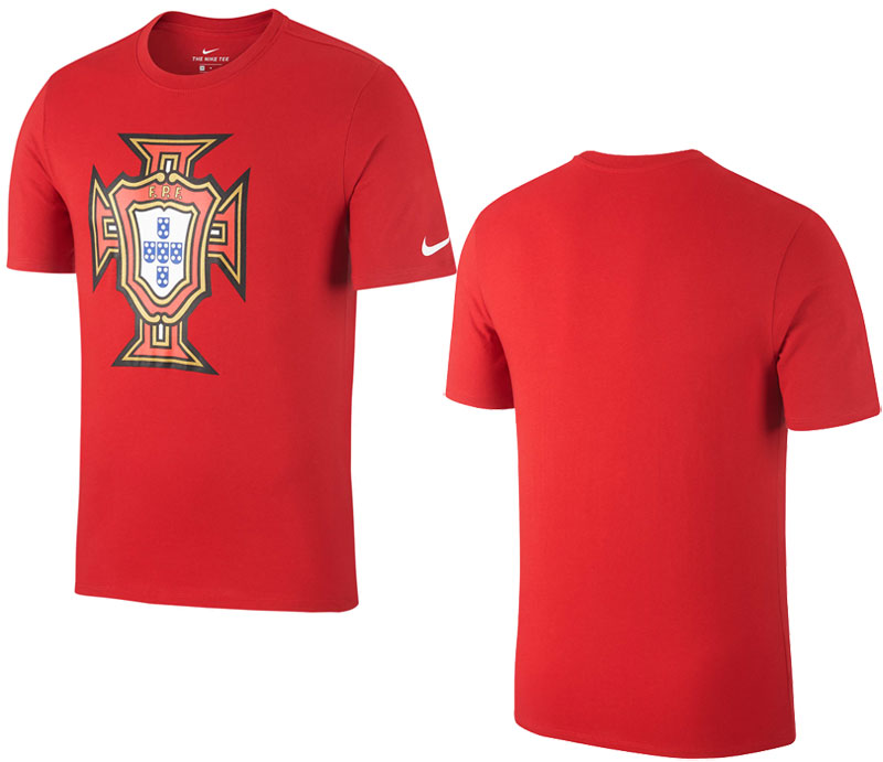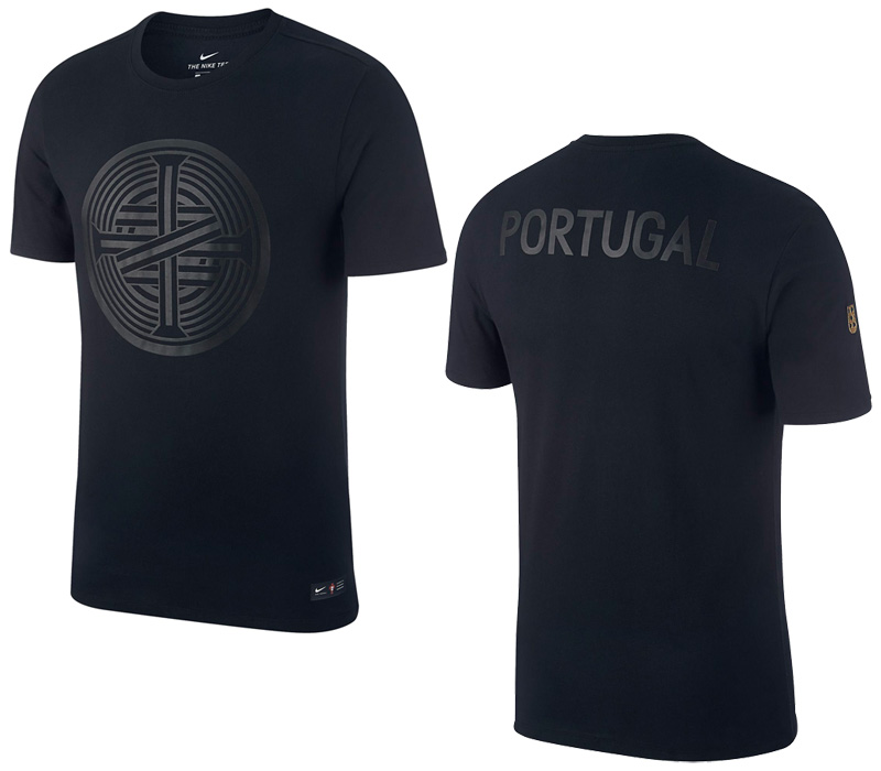 ブラックを基調としたスタイリッシュなTシャツ。前面は国旗に描かれている天測儀を、背中は国名をプリントしている。右袖の小さな柄はポルトガル国旗に描かれている「盾」をゴールドで配した。