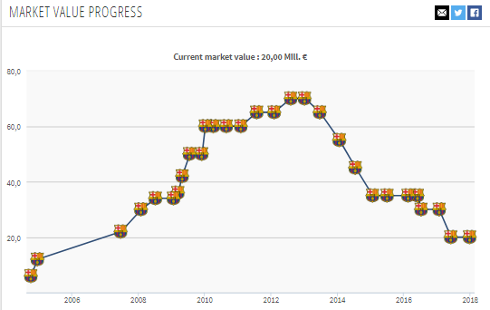 では、イニエスタの現在の市場価値は一体いくらなのか。『Transfermarkt』で調べてみた。