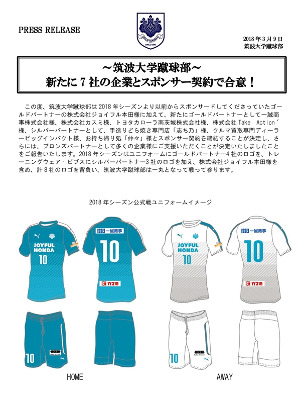 さらに、「自主管理」「自主運営」をテーマに自分たちですべてを賄う筑波大蹴球部では、実はスポンサー獲得までも学生選手が自分たちで行っている。今春にこのようなプレスリリースがメディアに向けて配信された。