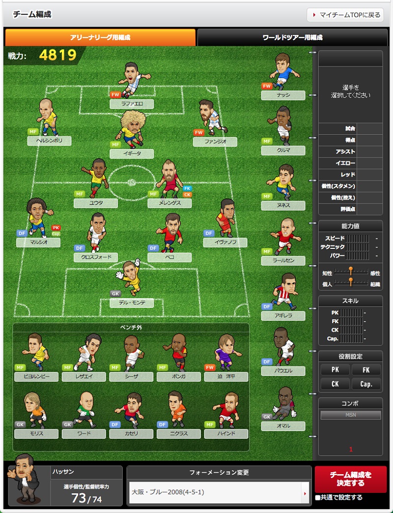 試合は所定時間に行われるので、空いた時間でフォーメーション設定や戦力補強をするだけ