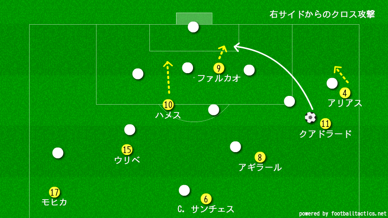 右サイドのクアドラードは、突破力がありキックの精度やバリエーションも優れています。なので、彼が右サイドからクロスを上げて、そこにファルカオやハメスが合わせる形も当然あります。