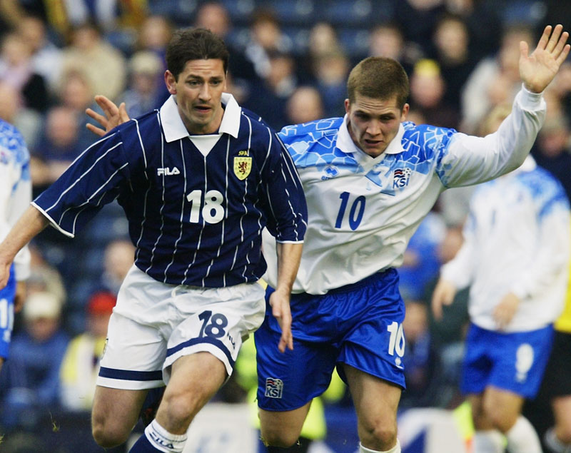 2003年3月に行われたEURO 2004予選のスコットランド代表戦での一場面。アウェイキットは白を基調とし、肩の氷河部分は青をメインカラーとしていた。