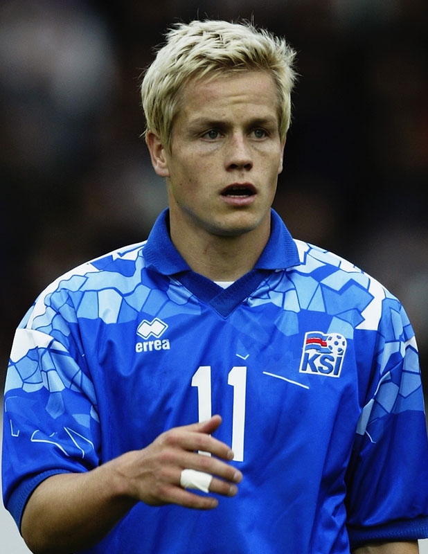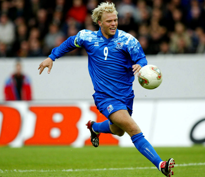 主にユーロ2004の予選で着用したerrea製ユニフォームの第一弾。9番は当時のアイスランド代表で唯一のワールドクラスだったエイドゥル・グジョンセンだ。