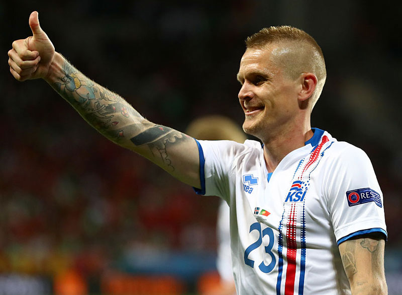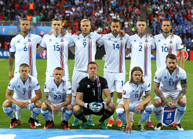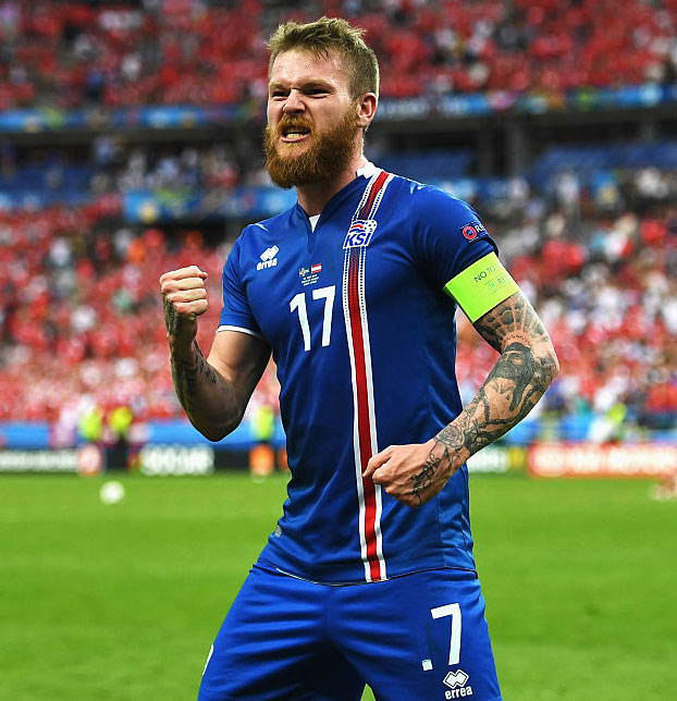 躍進の象徴となったこのユニフォームには世界中から注文が殺到し、メーカーの工場がフル稼働しても生産が追い付かないほどだった。画像はユーロ2016でオーストリア代表に勝利し、喜びを露わにするアロン・グンナルソン。