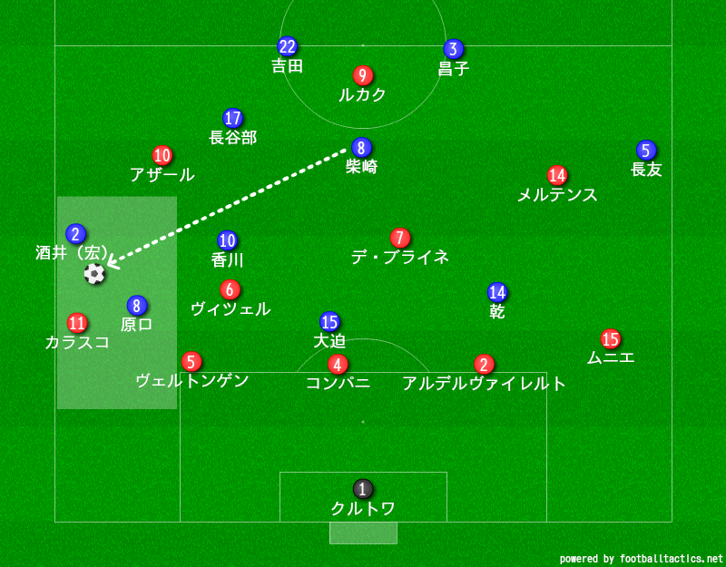 以上のことから、日本は(カウンターの起点となるアザールに対しては長谷部誠が付くことでリスクマネージメントできれば)、酒井宏樹と原口元気の縦関係、さらにそこにトップ下の香川真司も絡む形で、右サイドからの攻撃がキーになるのではないだろうか。