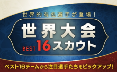 世界大会BEST16スカウトガチャが登場。世界大会ベスト16チームの注目選手が、特別アイコンの世界大会限定バージョンで登場。大迫勇也、クリスティアン・エリクセン、ルカ・モドリッチ、ラヒム・スターリング、サミュエル・ユムティティが★5で新登場。この機会を見逃すな!!