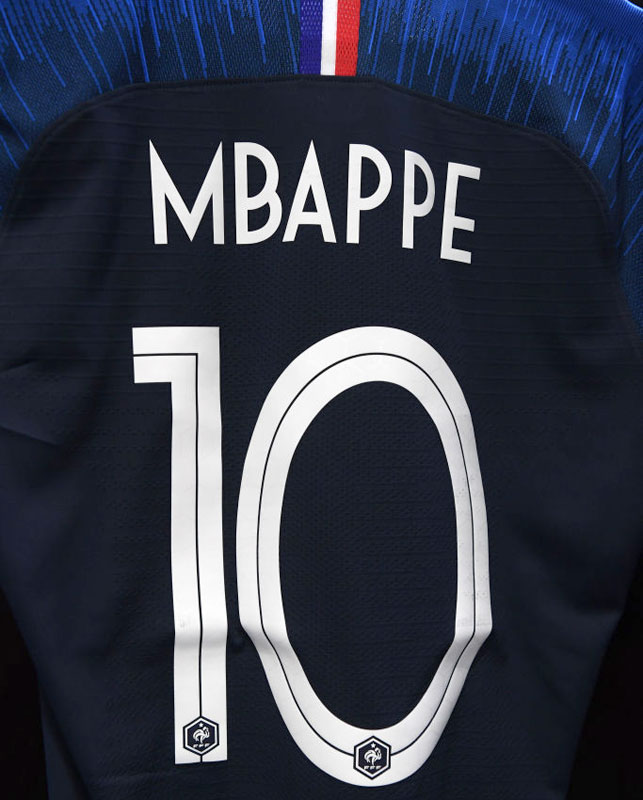 フランス代表のネームナンバーも紹介。画像は通常版のデザインだが、W杯では六角形の模様が無いバージョンが使われていた。