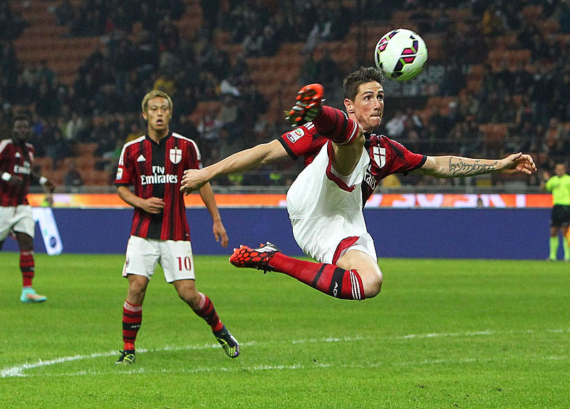 シーズン開幕直後の8月29日、ACミランへのローン移籍が発表された。この画像はプレシーズンマッチでの1枚。ユニフォームは2014-15ホームキットで、細めの水平ストライプがなかなかの好デザインだった。