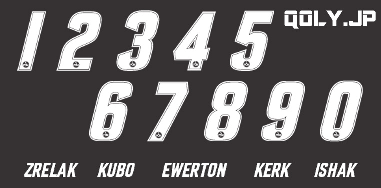 斜体のタイポグラフィが特徴的なネームナンバーの色はホワイトで、ホーム、サード両キットで使用。ローンで加入した久保裕也は14番を背負う。