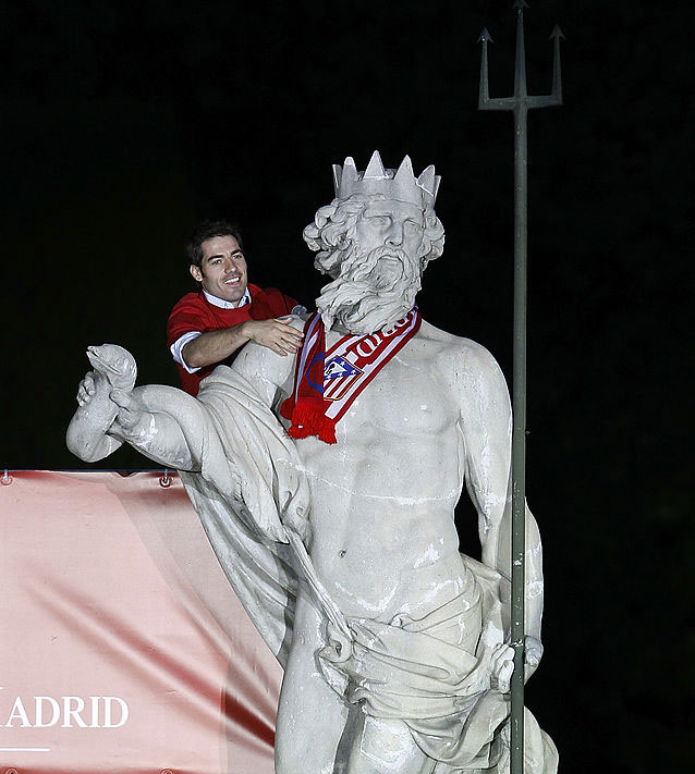 これが三叉槍を持つネプチューン像。画像は2010年のヨーロッパリーグ優勝祝賀パレード時の物で、ネプチューンの首にマフラーを巻いているのは、2014年に引退した元主将のアントニオ・ロペス氏。