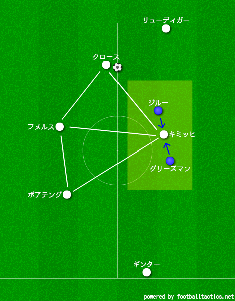 フランスは、基本陣形は4-2-3-1であるが、守備時はオリヴィエ・ジルーとアントワーヌ・グリーズマンがファーストディフェンダーとなる4-4-2に変化するのが特徴的。この試合でも、ドイツのビルドアップに彼らが最前線から網を張ってきたのだが、ここでキミッヒが取ったポジショニングは、この二人を牽制するような意図が感じられるものばかりあった。