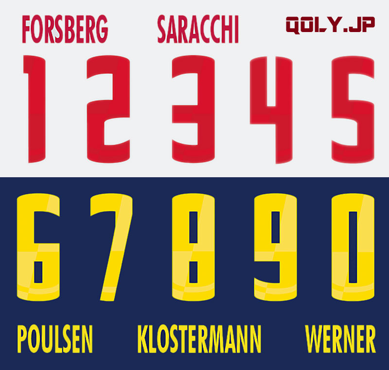 ホームとアウェイのネームナンバーをまとめて掲載。番号は独特なタイポグラフィだ。