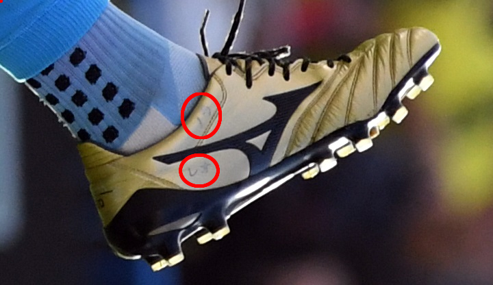スパイクに家族の名前を入れる選手は多い。同じくMizunoを履いているフッキも、日本で出会ったという妻イラン・ソウザさんや子供の名前を入れている。