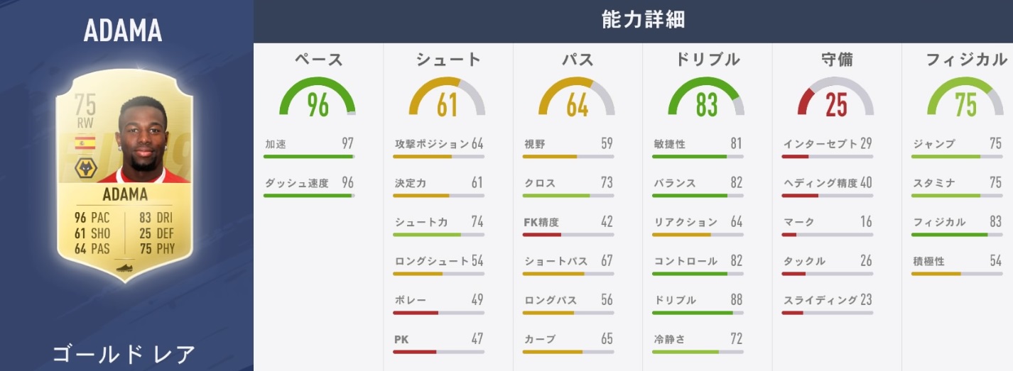 今作で最もスピードが速く設定されていたのは、アダマ・トラオレ(ウルヴス)で96という値だった。