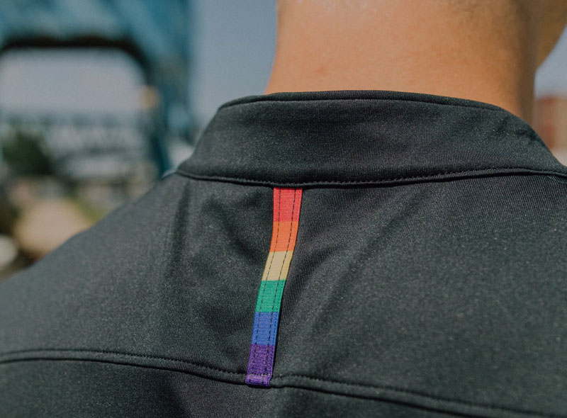 背面はブラック一色なので、首元のレインボーカラーのテープが際立つ。