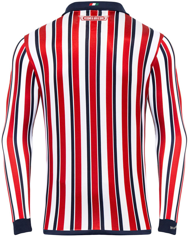 背面の首元にはメキシコ国旗カラーをあしらい、その下にはクラブのイムノの一節"MEXICANOS AL GRITO DE CHIVAS"をレタリングする。